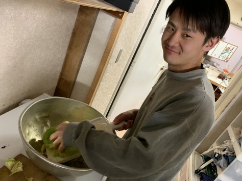 そんな中、みつはキャベツをスライスしていました