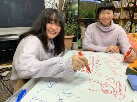 夕飯の準備がひと段落したところで、今度は、フリースペースにあるホワイトボードの書き替えを、ゆいかとさやかも手伝ってくれました!