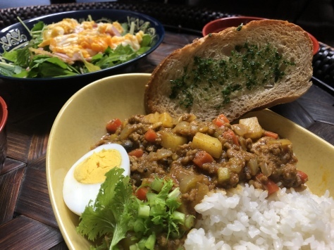 今日の夜ご飯は、具だくさんキーマカレーとエビのビスク、カラフルサラダ