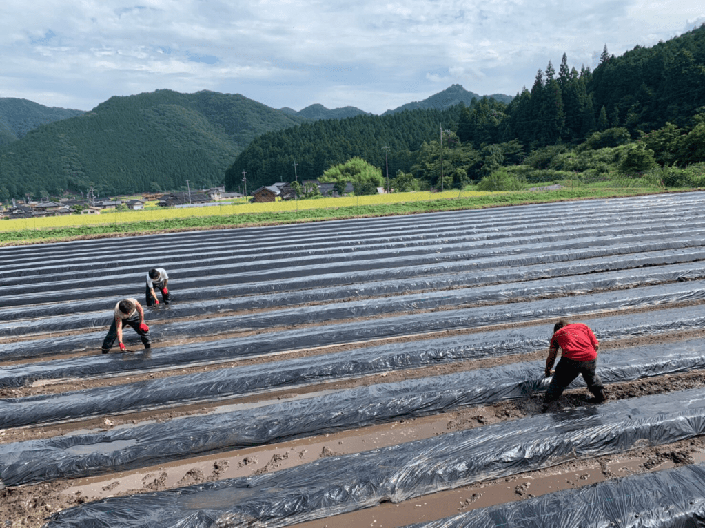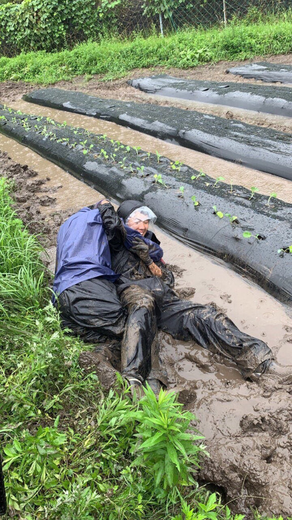連日の雨の影響で畑に水が溜まってしまい、足が半分埋まりながらの作業でした。泥ってけっこう重い…