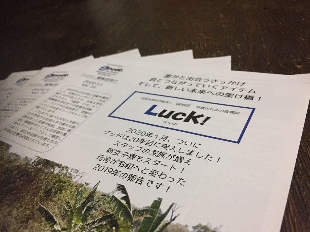 そう、luck!(ラック)の時期ですね!毎年、新年のご挨拶として、参加者のみなさんに送っている会報誌です。想いをたくさんつめこんでいるうちに、今年はこの時期の発送となりました。へへ。お待たせしたみなさん、すいません。