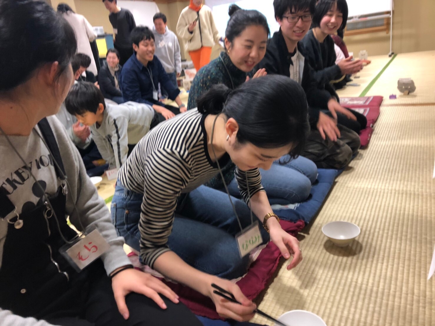 頭をたくさん使ったあとは、体を使ったゲーム!豆運びリレーをチーム対抗で行いました!