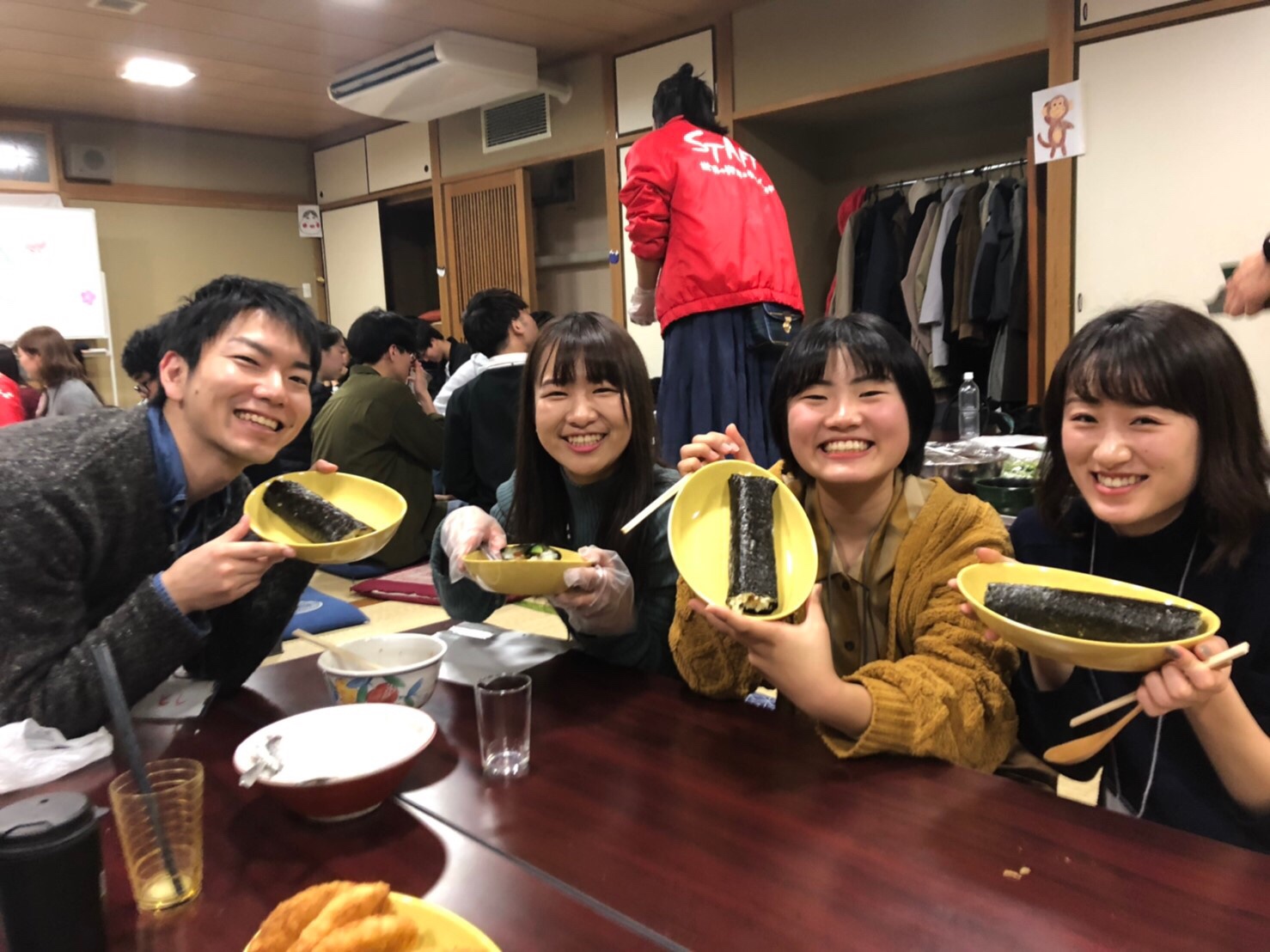 今年の恵方である西南西の方を向いて、福が逃げないよう、自分で作った恵方巻を喋らずにモグモグ、、なかなかシュールな光景でした(笑)