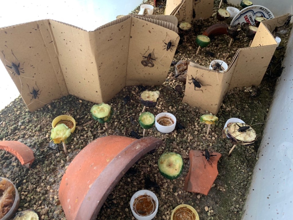 よーく見ると、野菜を輪切りしたものに爪楊枝が刺されていたり、ペットボトルのキャップに餌がのったりしていますよね。