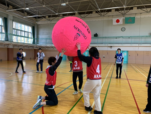 キンボールとは、チームごとに分かれて大きな1つのボールを床に落とさないように競うゲームです。