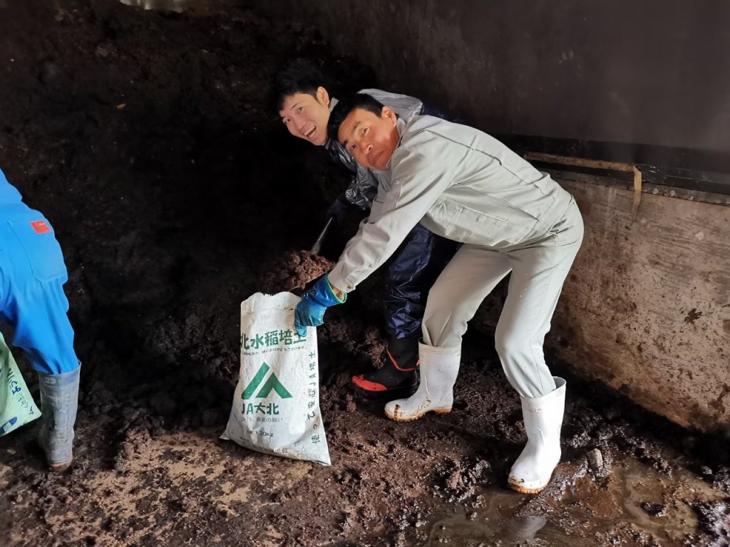 堆肥は倉庫のような場所に高く積まれていて、それを2人1組になって袋詰めしていきます。