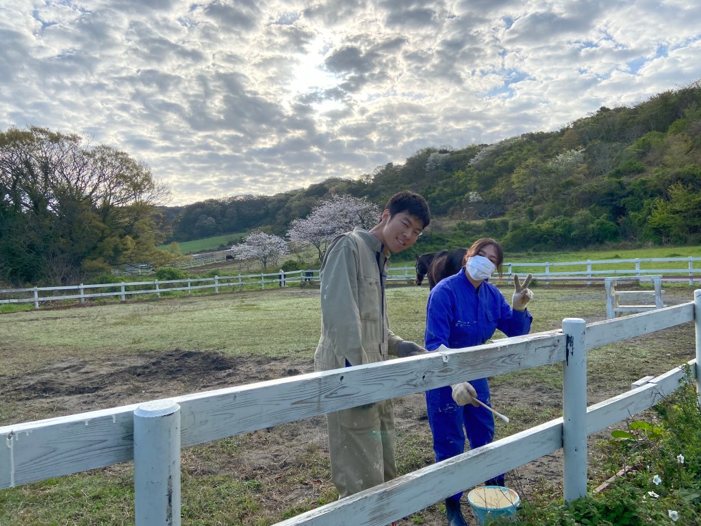 次はペンキ塗り🎨 ウマを放牧する場所の柵と、ソフトクリームなどを売っている売店を綺麗にしていきました!