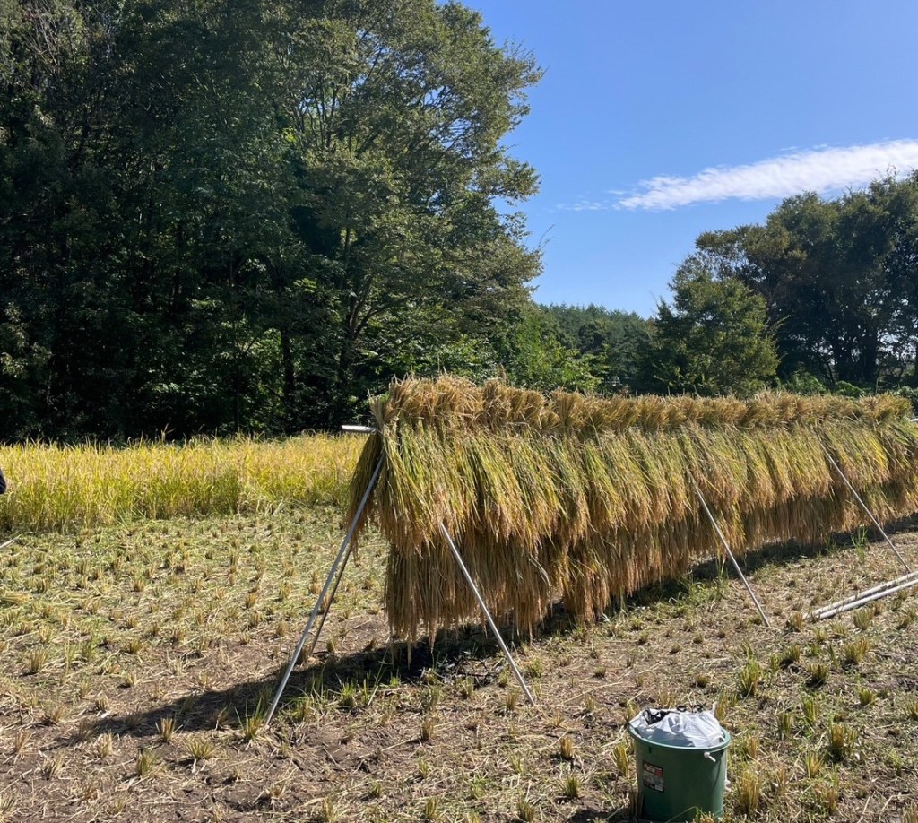 まとめた稲は、湿度の低い秋の日差しの下で、天日干しにします。お米は水分が多いので、保存のために乾かすんです。この作業をハザ掛けと言います。秋の田んぼでよく見る光景ですね。