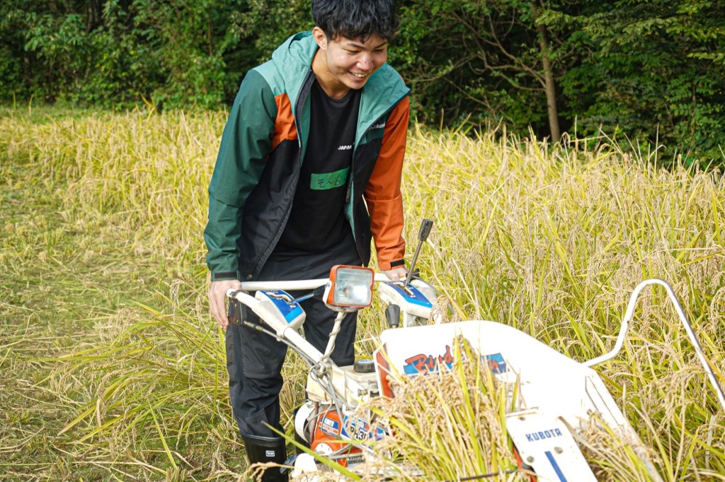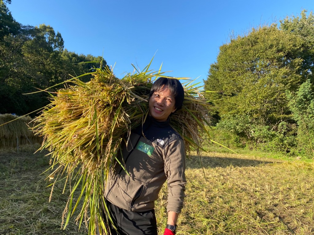 今回のワークは稲刈りでした🌾田んぼ2反分を手刈りやコンバインという機械を使って、収穫していきました。1反は、50mプール(50m×20m)なので、かなり広い範囲を刈ったんですよ~