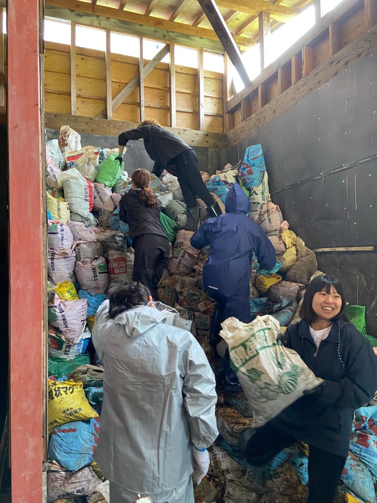 これをスコップで袋に詰めて、その袋をトラックの荷台に積んでいきます。多い時はなんと160袋も乗っちゃいます!