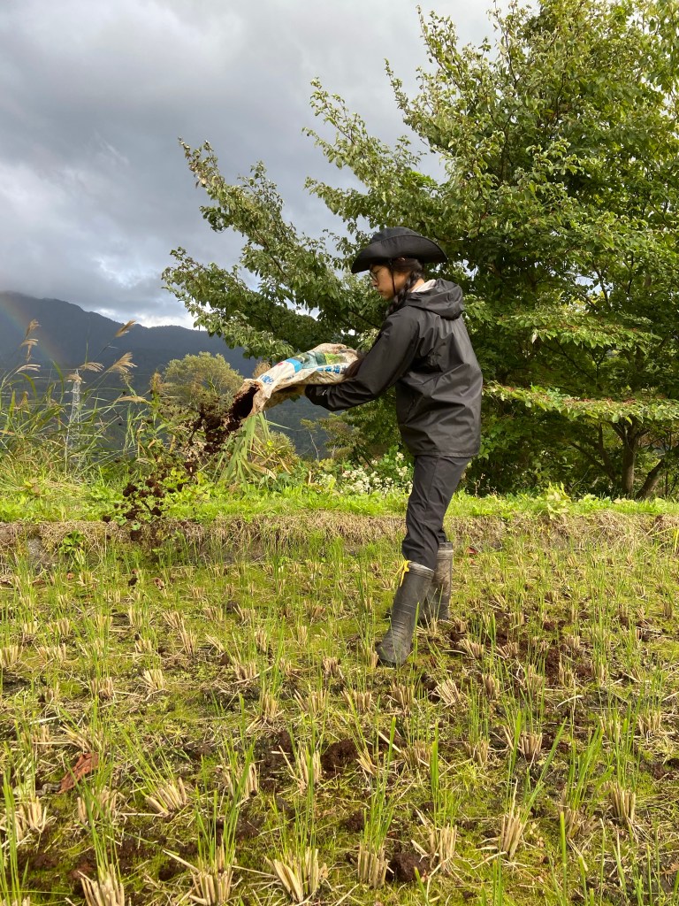もう一つのワークが、「堆肥まき」です!堆肥というのは、先ほどのスゲを食べて育った動物たちの排泄物や、生活の中ででた生ごみ等を発酵させて作られた100%自家製の肥料です!
