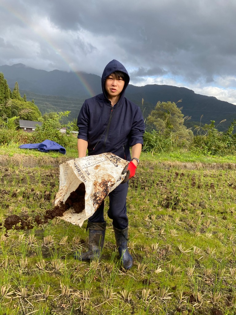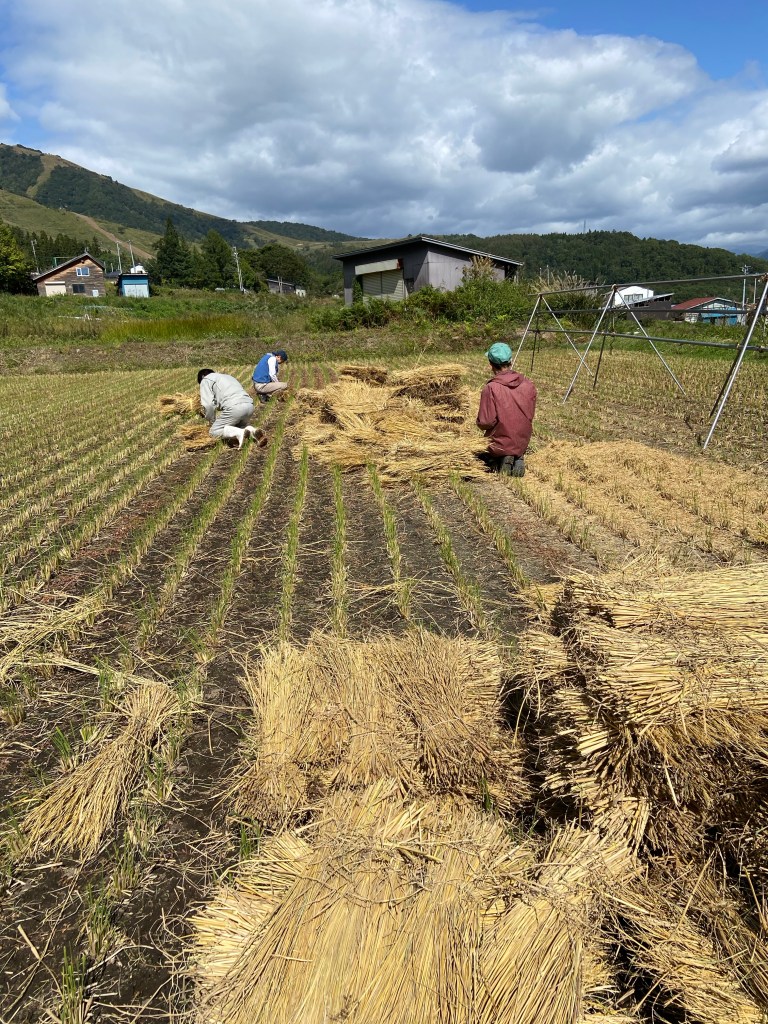 上の写真のように稲藁を束ねて、大きな束にしていきます。これが意外と難しい作業で、力をかなり加えないと緩くなってしまったりするので、一気にぎゅっと縛るのがポイントです💡 この”スゲ”は牛舎に運ばれて牛や、やぎなどの家畜たちの餌となります!