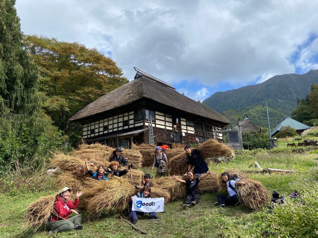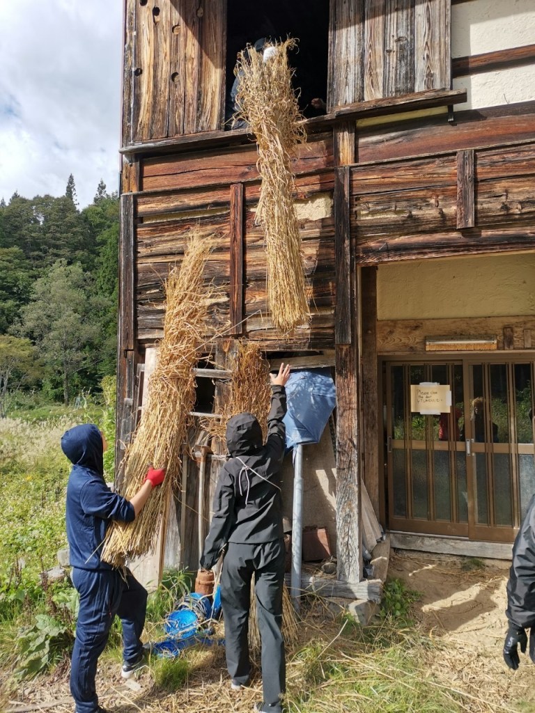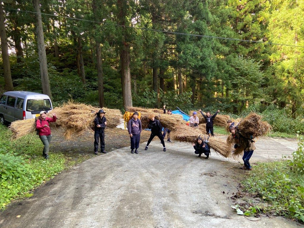 続いては荷揚げワークです!荷揚げとは、峠を二つ超えた先の真木とよばれる集落まで、背負子(しょいこ)という背中に背負う道具を使って様々な荷物を届けることです。今回は、かやぶき屋根の材料の茅(かや)を届けに行きました🏃♀️ 定期的に補修しないと、かやぶき屋根のお家が雨漏りしたり、雪で壊れてしまうので、それを防ぐために頑張って運びます!