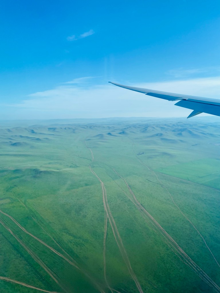 モンゴルに近づくにつれて、飛行機の窓からみる景色は、緑の絨毯と晴々とした青空!