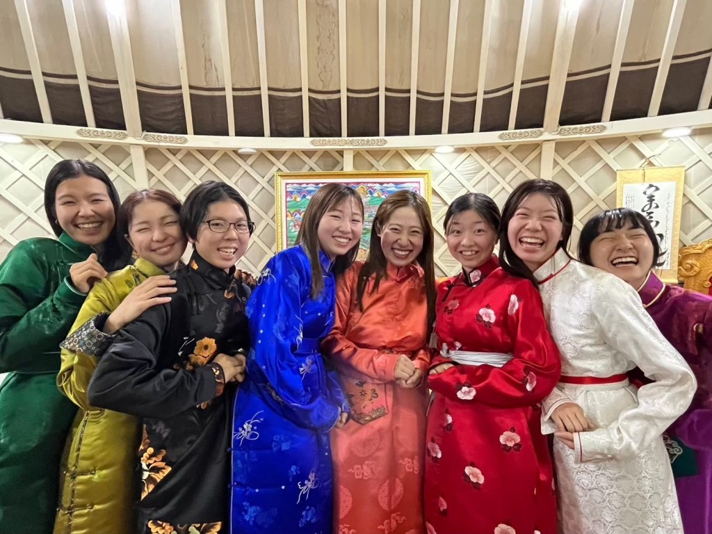 到着すると、ゲルというモンゴルの伝統的な移動式住居で歓迎会をしてもらい、モンゴルの民族衣装のデールを着させてもらいました。