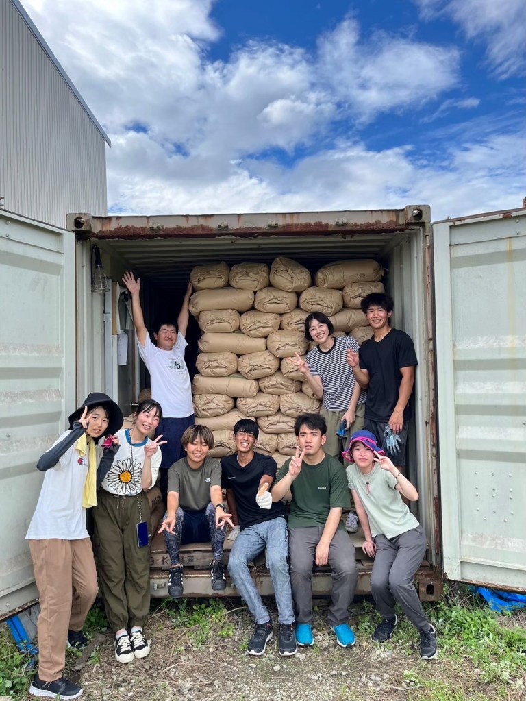 袋に入れたお米はコンテナの中に入れます!みんなで協力して手作業で積み込みました!