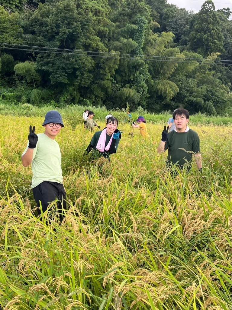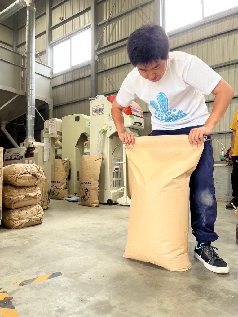 次に籾摺りという作業についてです!籾摺りはコンバインで収穫後のお米を玄米にして袋詰めする作業です🌾これが一袋なんと、30キロ‼️積み上げるのも一苦労!みんなで協力して頑張りました。