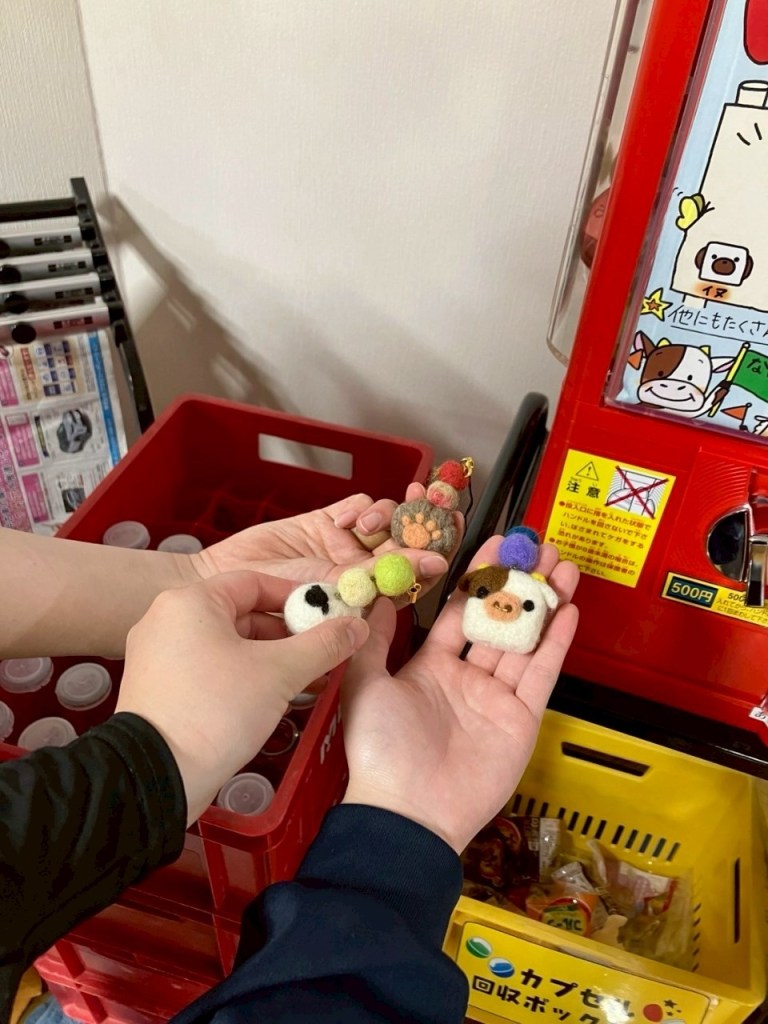 ワークの後はなんと…温泉!デン牧のB型作業所の方々が手作りしたフェルトでできたキーホルダーのがちゃがちゃ、色んなデザインがあってかわいいです😍