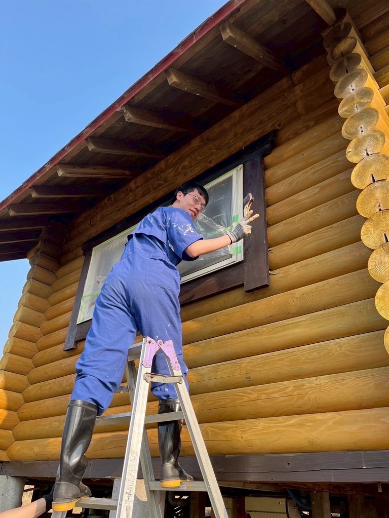 2つ目は、ペンキ塗りです!ソフトクリームを販売するログハウス風の売店がコケなどでだいぶ汚れてしまっていました…そこで、コケや細かい汚れを取り除き、木材の腐敗防止のペンキを塗りました!とても気温が高く屋外での作業は大変でしたが、見違えるように綺麗になりました!週末の開店に間に合って良かったです!