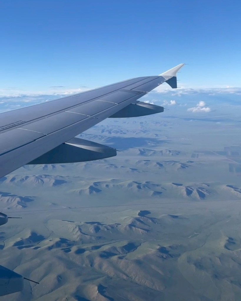 飛行機の窓から草原が見えてきれいでした!モンゴルにつくことがとても楽しみ。飛行機から見下ろす大草原は本当にキレイ。
