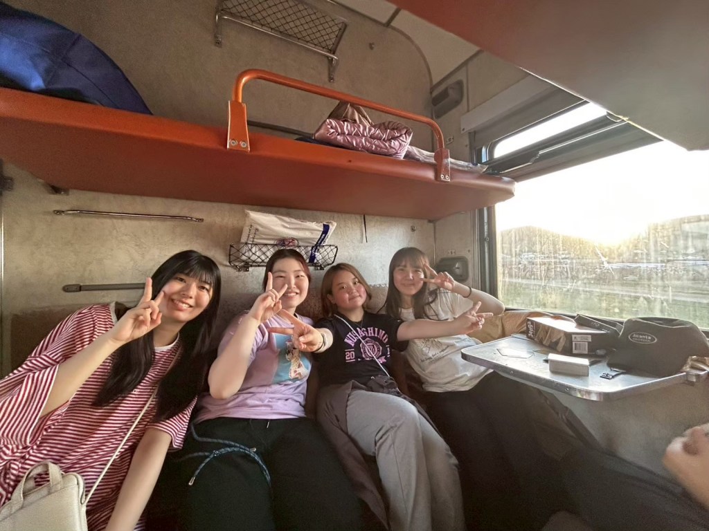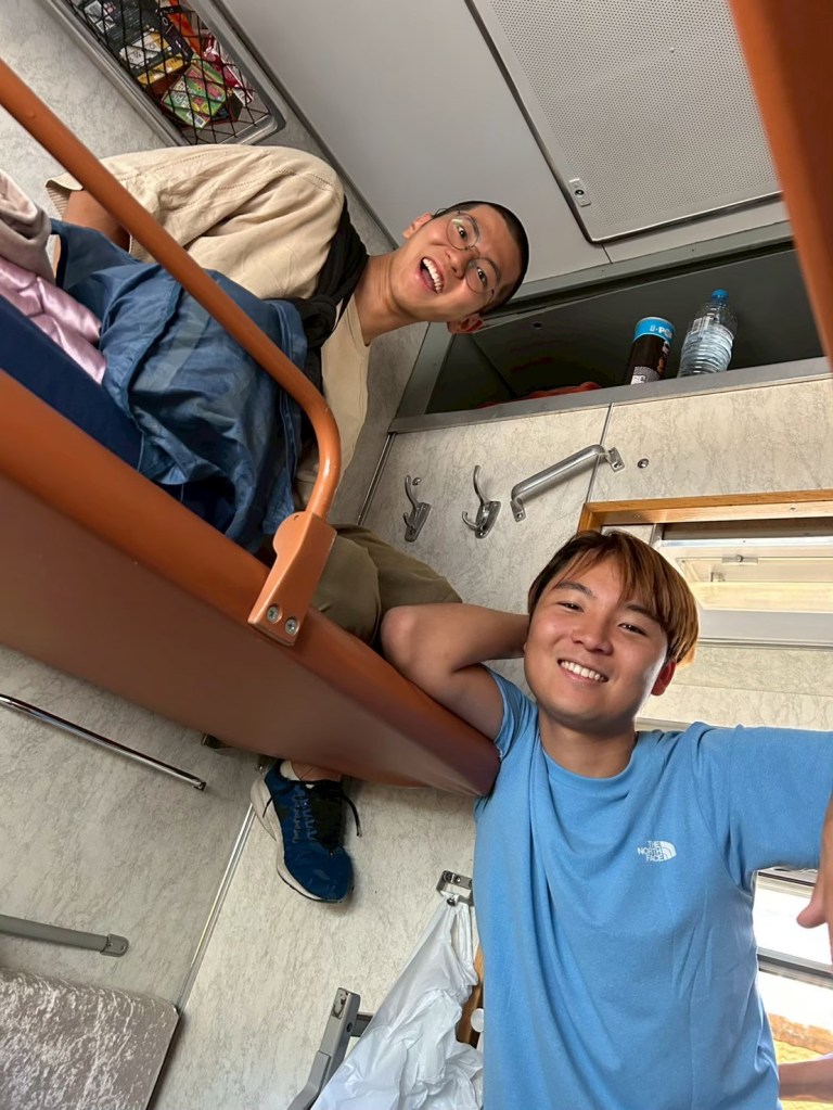車窓から見えるどこまでも広がる草原と美しい夜空は、私たちにモンゴルの壮大さを感じさせるとともに、ここでどう生きるかを問いかけてくるようでした。まだ、緊張はしていましたが、寝台列車に乗ったら緊張がすっ飛びました。初めて乗る寝台列車、目の前の草原に大興奮。