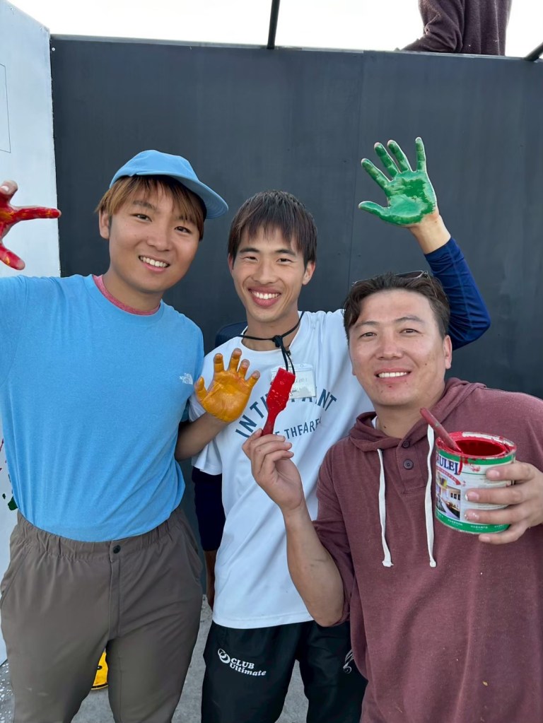 最後は、みんなの手形をステージの壁に押しました。有志の人は夜遅くまで残業をして「good!」の文字を書いてくれました!こうしてステージが無事完成しました!