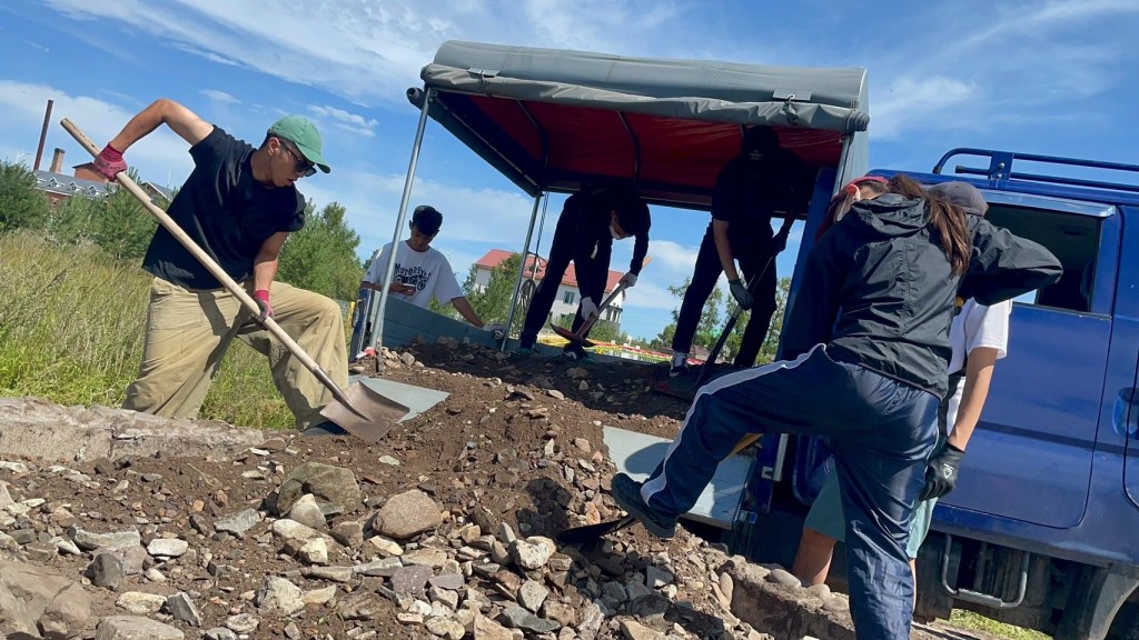 石や砂はモンゴル人が運転する車に乗って、近くの川や丘まで取りに行きました。重い石や砂を何回もシャベルを使って荷台に積み上げるのはとても大変でした。一方でそれを軽々とやるモンゴル人の力強さに圧倒されました笑。道中、モンゴルの子守歌を一緒に歌ったり、アイスを一緒に食べたりすることでモンゴル人と更に仲良くなれました。