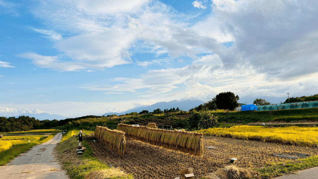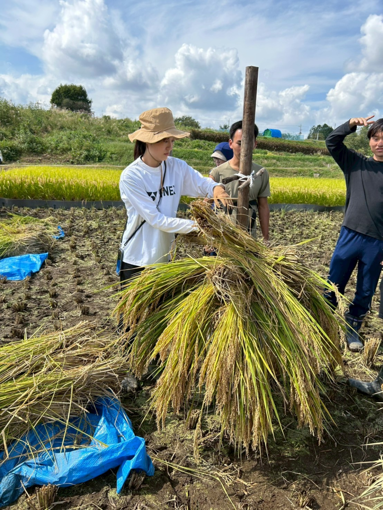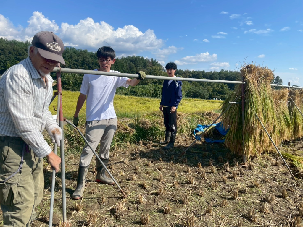 この後、まとめた稲は、「ハザ掛け」と呼ばれる方法で天日干しをしていきます。