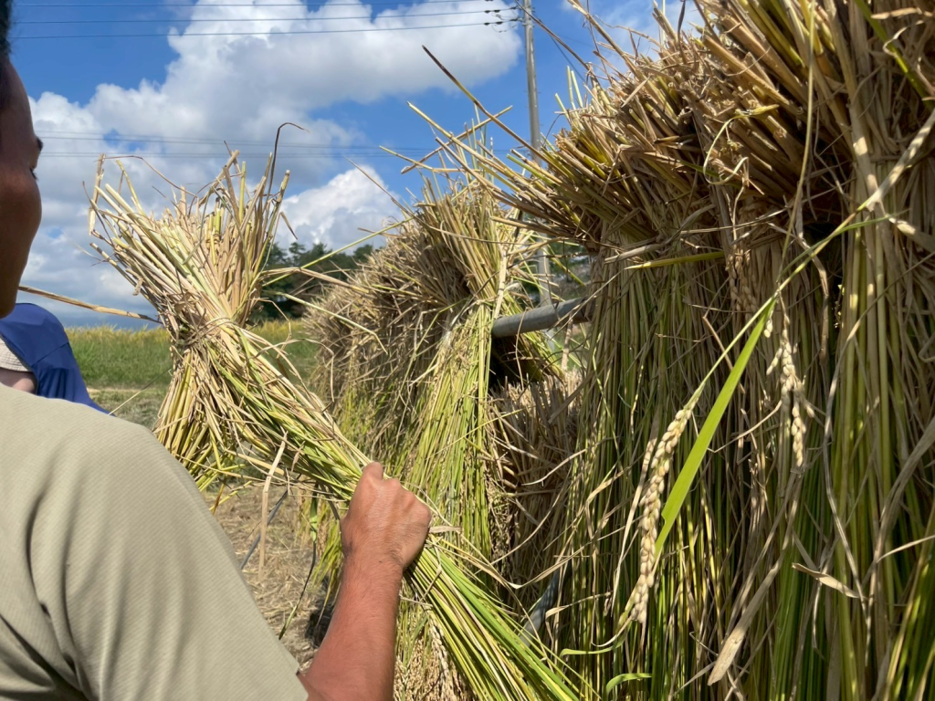 太陽の光と自然の風でじっくり乾燥させることで、お米に旨みがぎゅっと詰まるんです。また、稲を逆さまに吊るすことで、わらの油分や栄養分、甘みが最下部の米粒へおりて、栄養とうま味が増します。乾燥には1〜2週間ほどかかりますが、その分、機械乾燥とは違った香りや味わいが楽しめると言われています。