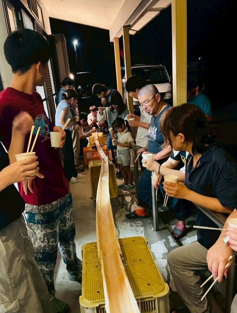 中盤には流しそうめんも行われました!!この竹もはぐれ雲の方のお手製で、私たちも竹削りのお手伝いをさせていただきました✨️