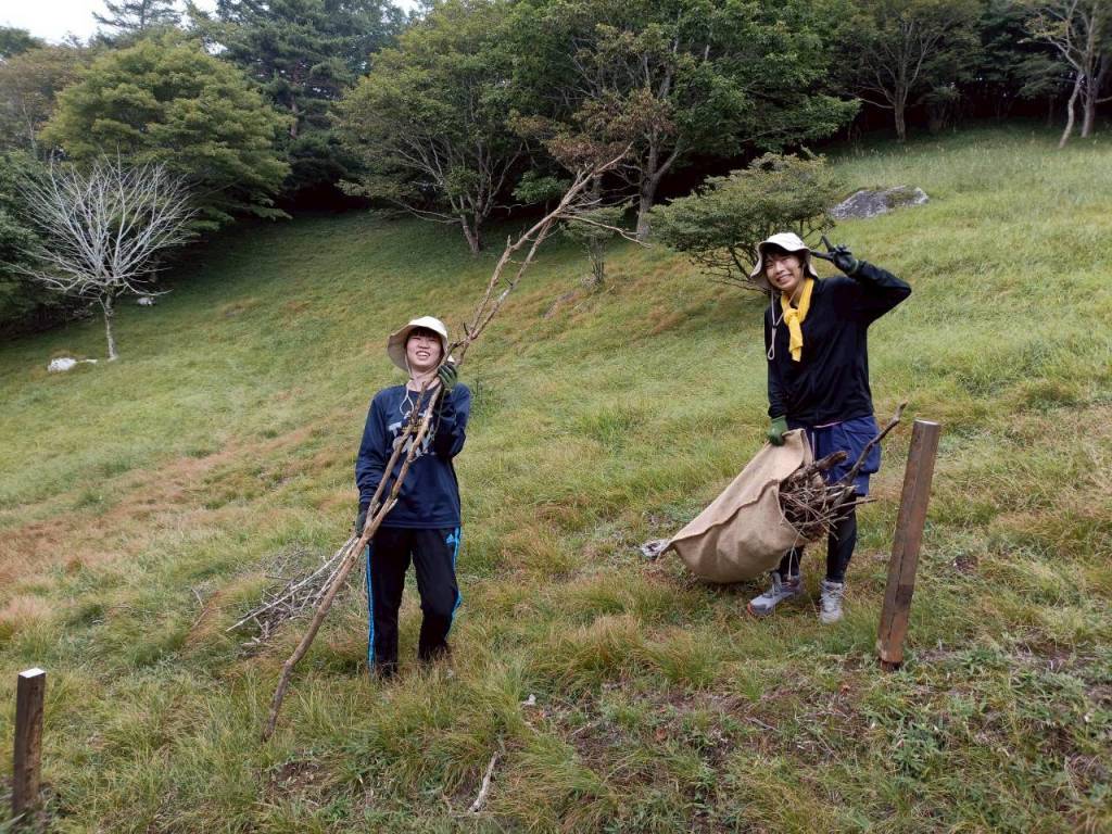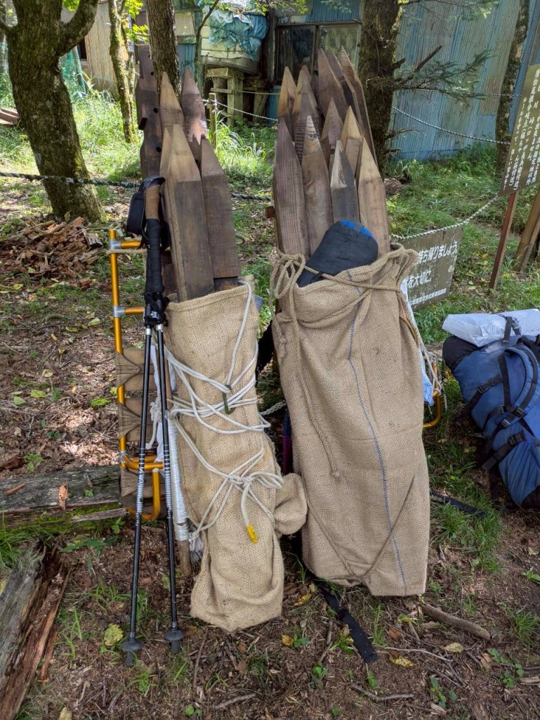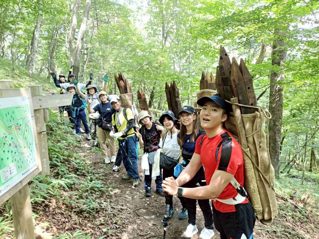 背中に背負っているのは登山道の柵を修復するための木の杭です!1本約2㎏の重たい杭(4本~8本)をみんなで交代しながら運びました!