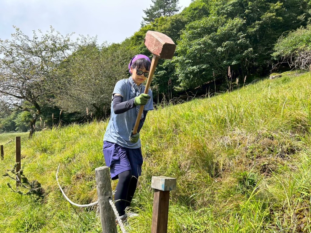 霧も晴れて、山の上での2つ目のワーク!!登山道の柵の杭打ちです!!