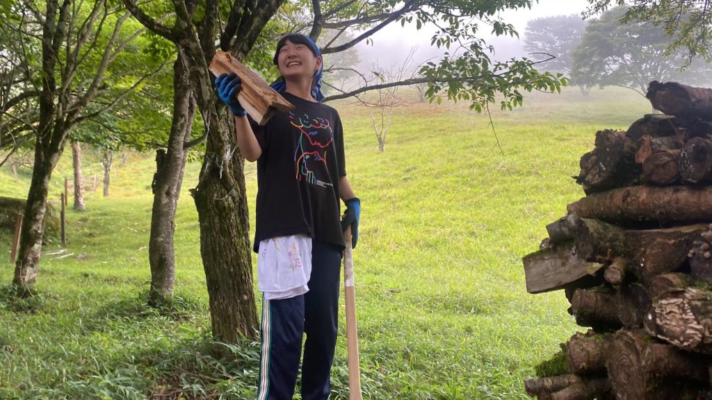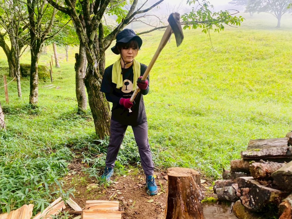 そして山小屋で使う薪割りも体験させてもらいました!これも初めての経験で、斧の扱いに少し怖さを感じましたが、きれいに割れた時はとても気持ち良かったです!