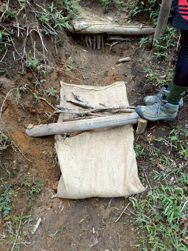 みんなで集めた土や枝を麻袋に入れて…。登山の後でしたが、あっという間に完成!!