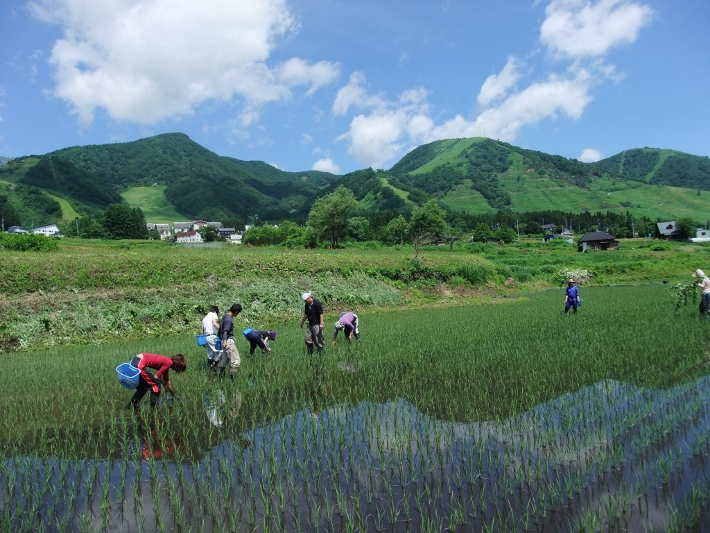 6 月のプログラムでは、田んぼの草取り、大豆の定植、山上集落への荷揚げなどを行います。