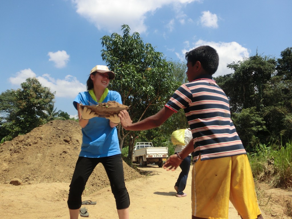 ワーク地につくと、じりじりとくる暑さの中、鍬やスコップを使いながら、砂を運び、石を運び、セメントをこねた。慣れない体力仕事はきつかったけど、みんなで励まし合ったり、大声で歌ったりしながら汗を流した。休憩のとき飲む紅茶も甘くて美味しかった。完成の時、村人とキャンパー全員でハイタッチをした瞬間は、本当に本当に幸せだった。みんなと一緒に1つのものを作り上げることが出来て、自分の自信にも繋がった。